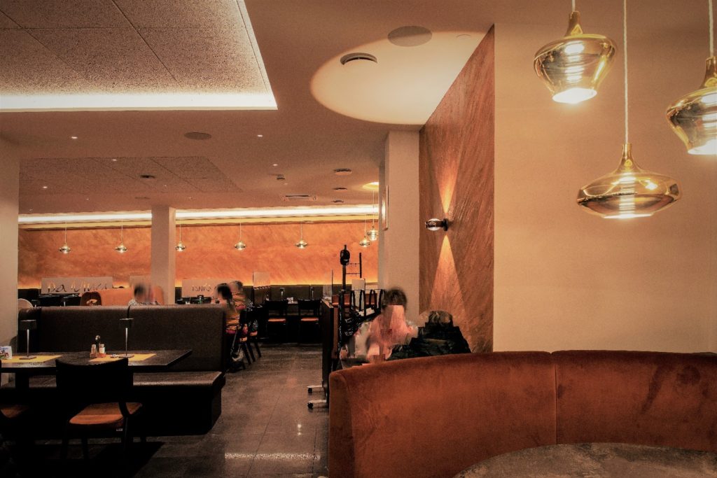 Das Raumlicht wird über die Lichtdecken und Einbauspots erzeugt, die Pendelleuchten dienen zum einen der Ausleuchtung der Tische und bilden zum anderen den dekorativen Anteil, das Licht zum ansehen. Wandleuchten heben die besondere Wandstruktur hervor und lassen die Oberfläche glänzen.
