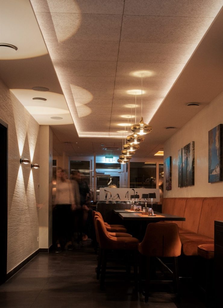 Im Vordergrund stand dabei die Steigerung der Außenwirkung und die damit einhergehende Mehrung von dekorativen Lichtelementen in Restaurant. Damit wurde nicht nur die Außenwirkung verstärkt sondern auch die Raumstruktur unterstützt. So wurden besondere raumbildende Elemente wie die Theke, die Hochtische im Gang als auch die „Séparées“ mittels der Pendelleuchten hervorgehoben und gleichzeitig Zoniert.